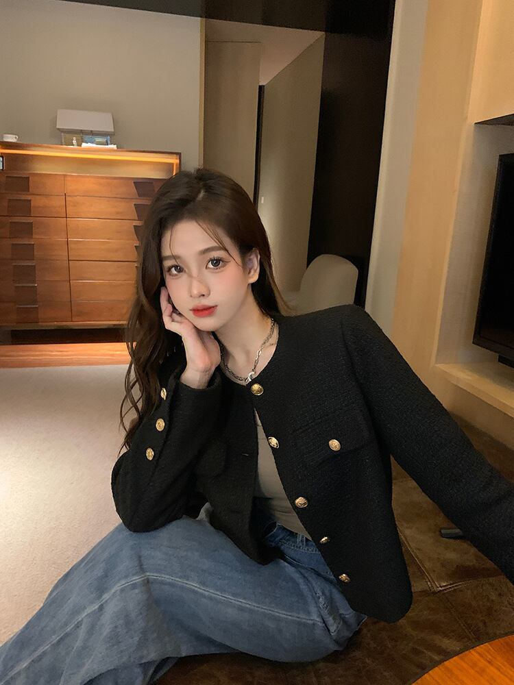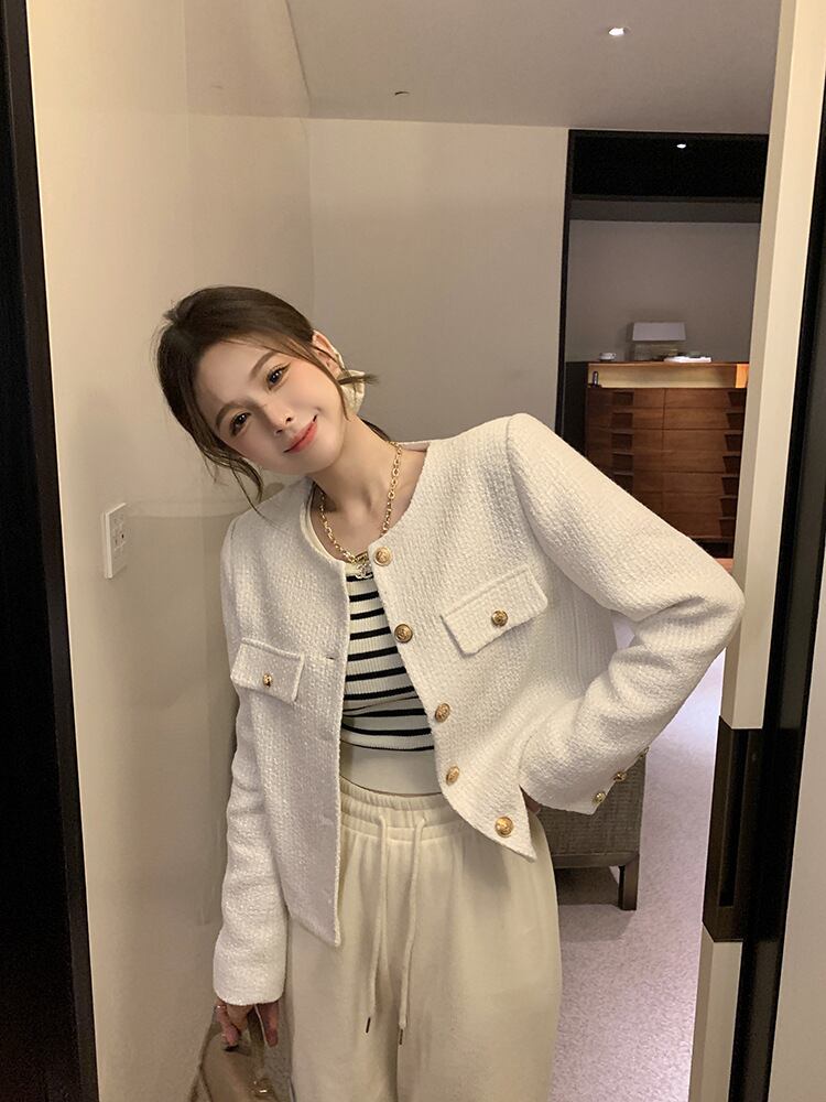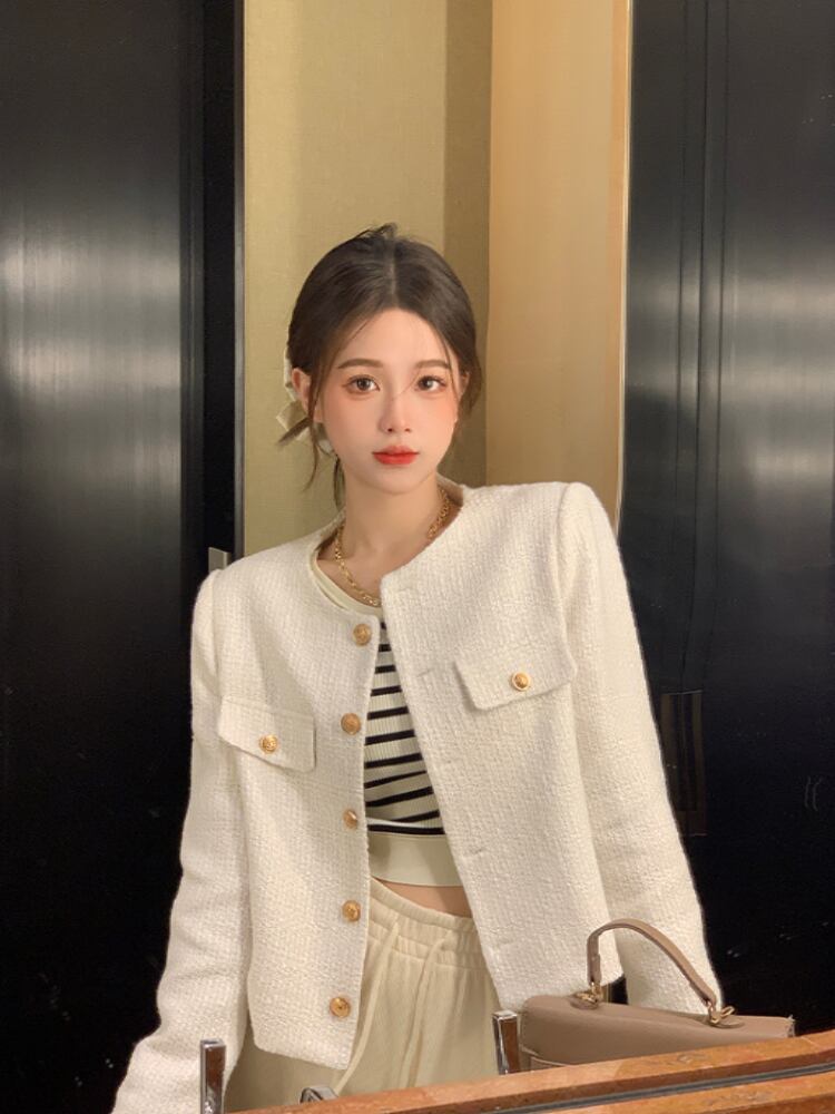 【送料無料】 ツイードジャケット ノーカラー ショート丈 オルチャン ゴールドボタン 韓国 きれいめ 普段使い レディース 金ボタン デイリー ブラック ホワイト アウター 長袖 ラウンドネック スマート かわいい 大人可愛い きれいめ 大人 上品 おしゃれ かっこいい レトロ 大人女子 こなれ感 個性的 クール モード系 フォーマル 抜け感 女性用 ママ OL 通勤 デート 女子会 お泊まり 休日 旅行 レストラン ショッピング コーデ スタイル 楽ちん モテ トレンド 流行 インスタ映え
