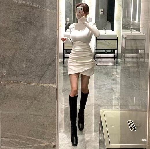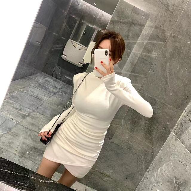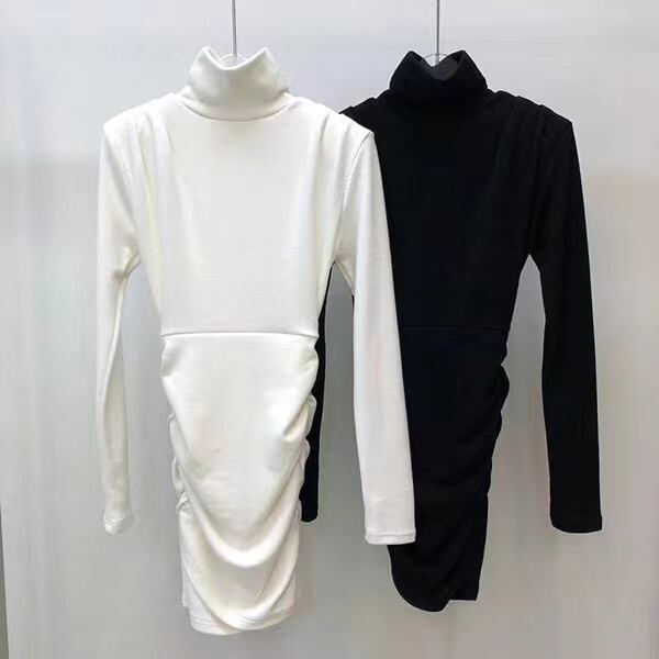 【送料無料】 タイトミニワンピース シャーリングワンピース ハイネック 韓国 レディース オルチャン 黒 ブラック 白 ホワイト 長袖 スリム タイト 細身 アシンメトリー スマート ハイウエスト 伸縮性 大人可愛い きれいめ シンプル 上品 おしゃれ かっこいい こなれ感 ラブリー キュート クール モード系 セクシー エレガント 抜け感 フェミニン 無地 春 秋 冬 休日 イベント デート ショッピング 着回し 普段使い 重ね着 モテ トレンド 流行 インスタ映え S M L XL
