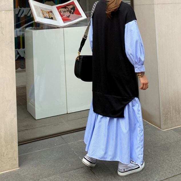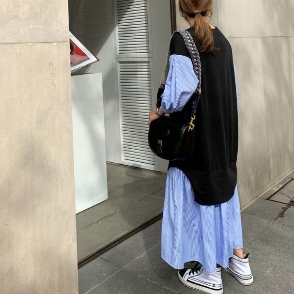 【送料無料】 シャツワンピース 襟付き ボーダー 大きいサイズ 韓国 レディース オルチャン 黒 ブラック 青 水色 長袖 Uネック 異素材ミックス ボタン かわいい 大人可愛い きれいめ おしゃれ こなれ感 ラフ エレガント フリーサイズ モダン ゆったり ぽっちゃり 2XL 3XL 4XL 5XLオフィス ビジネス 通勤 通学 抜け感 フェミニン アクティブ ベーシック ナチュラル オトナ女子 大人女子 春 秋 冬 秋冬 休日 カフェ デート トレンド 流行 インスタ映え