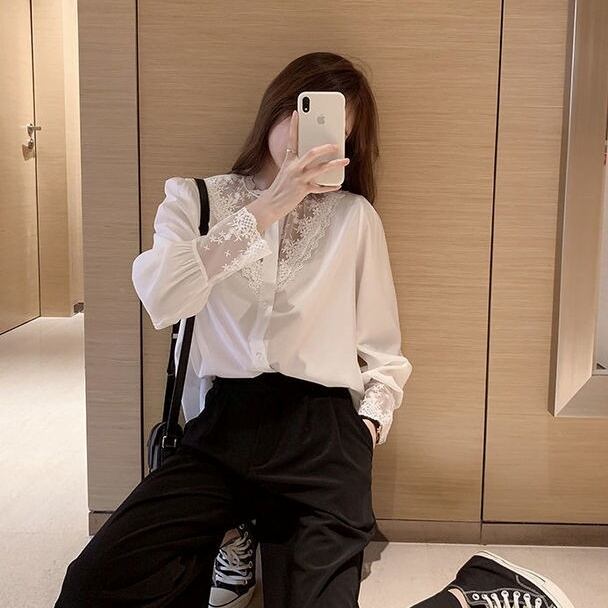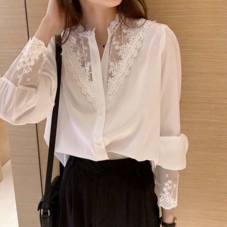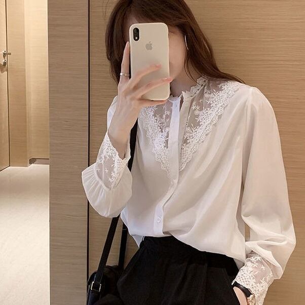 【送料無料】 ブラウス Vネック シャツ シフォン レース 長袖 オフィスカジュアル レディース 韓国 オルチャン ホワイト スリム 細身 スマート 白 黒 ブラック 襟あり かわいい 大人可愛い きれいめ 大人 上品 おしゃれ かっこいい 大人女子 こなれ感 キュート エレガント モダン Uネック フォーマル 抜け感 オールシーズン ボタン ママ ビジネス OL 通勤 デート 女子会 お泊まり 休日 レストラン 普段使い コーデ モテ 定番
