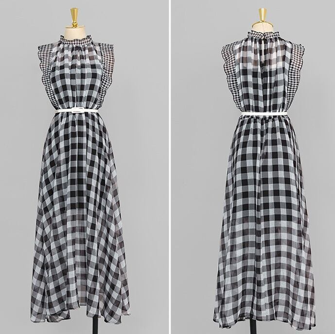 【送料無料】 シフォンドレス ギンガムチェックワンピース ベルト付き 韓国 レディース オルチャン 黒 ブラック フレアワンピース ワンピドレス ミモレ丈 袖なし ノースリーブ スタンドカラー フリカラー フレア Aライン 切り替えデザイン ドッキング フリル ウエストマーク ハイウエスト 薄手 かわいい 大人可愛い おしゃれ こなれ感 ラブリー キュート 抜け感 フェミニン 大人女子 夏 女子会 休日 イベント リゾート トレンド 流行 インスタ映え S M L XL モノトーン