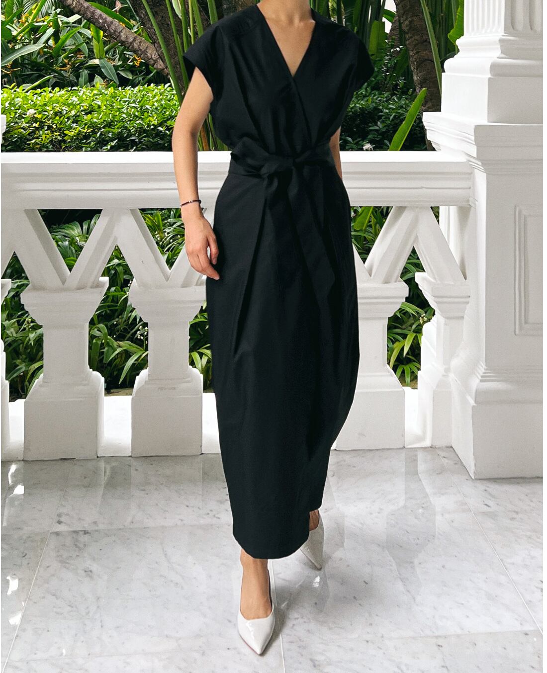 Vネックとウエストリボンが華やかな印象を与え、Aラインのシルエットで美しいラインを演出します。