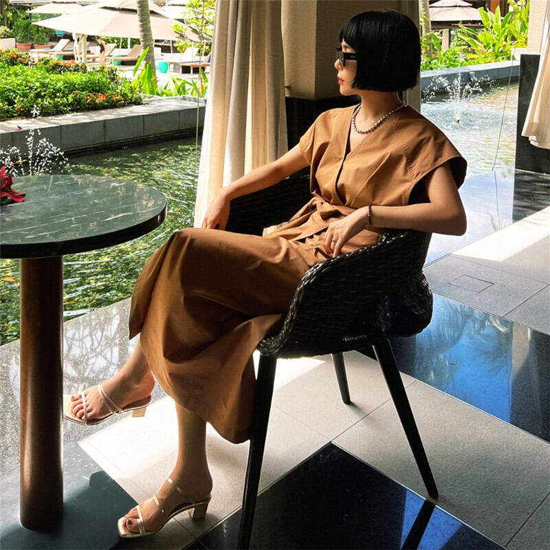 【送料無料】 ワンピース ノースリーブ ミドル丈 Vネック ウエストリボン Aライン ルーズ 韓国 レディース かわいい 可愛い キュート 大人可愛い 大人女子 シンプル きれいめ カジュアル 大人 気品 上品 おしゃれ お洒落 こなれ感 きちんと 大人女子 クール エレガント フェミニン S M L XL カーキ ブラック 春 夏 オルチャン 20代 30代 40代 女子会 デート ショッピング お泊まり 休日 旅行 普段使い デイリー コーデ トレンド 脚長 美脚 スタイル 楽チン