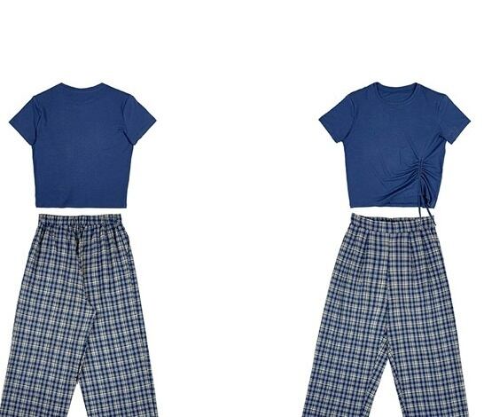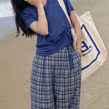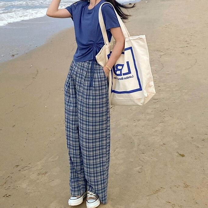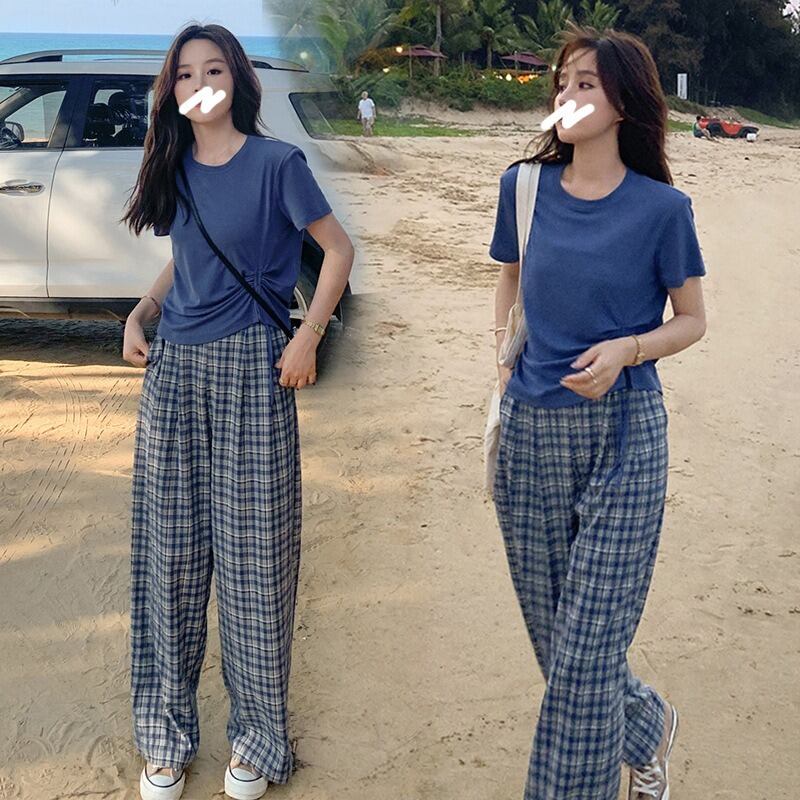 【送料無料】 Tシャツ 上下セット セットアップ ワイドパンツ 半袖 Uネック 韓国 レディース オルチャン 袖あり ラウンドネック チェック柄 薄手 楽ちん 青 ブルー 2点セット ツーピース お得 M L XL ネイビー 無地 春 夏 春夏 10代 20代 30代 40代 50代 60代 女性用 男女兼用 ママ 母 お泊まり 休日 運動 ジム ヨガ リゾート 海 プール 楽ちん 着回し 着痩せ