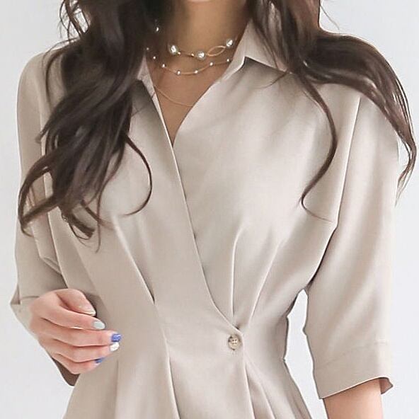 VネックとAラインのシルエットが美しい輪郭を作り出し、女性らしい魅力を引き立てます。
