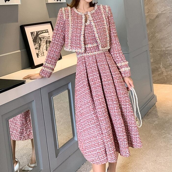 【送料無料】 ツイードセットアップ ツイード セットアップ ピンク 韓国 ツイード 高見えツイードセットアップ ツイードワンピース オルチャン パーティードレス オールシーズン ミモレ丈 ボレロ 胸元 谷間 レディース セミフォーマル セットアップ ワンピース テーラード ショート丈 高見え 高級感 可愛い かわいい 大人可愛い 大人 おしゃれ お洒落 大人女子 こなれ感 個性的フェミニン エレガント 主役級 存在感 抜け感 S M L デート 女子会 パーティー イベント 普段使い モテ