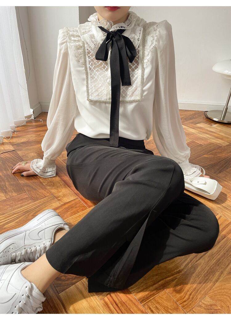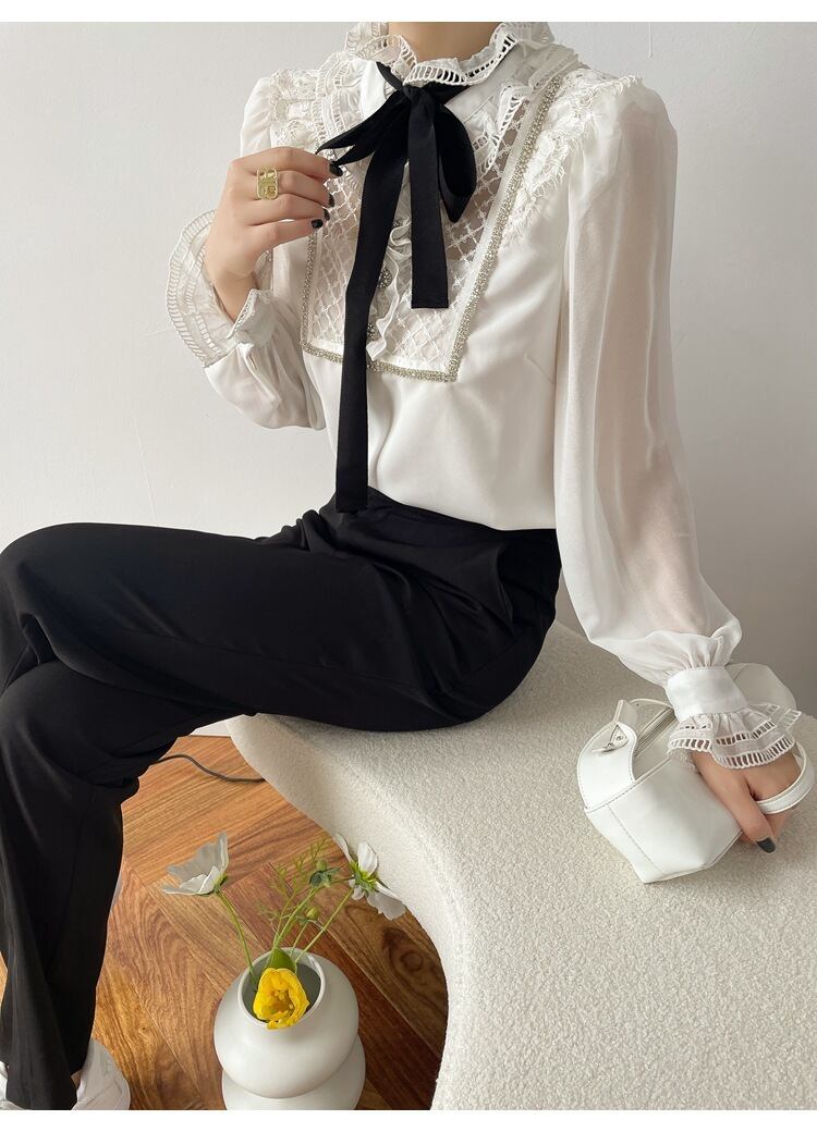 リボンタイやレース、フリルが可愛らしい魅力的なブラウス。