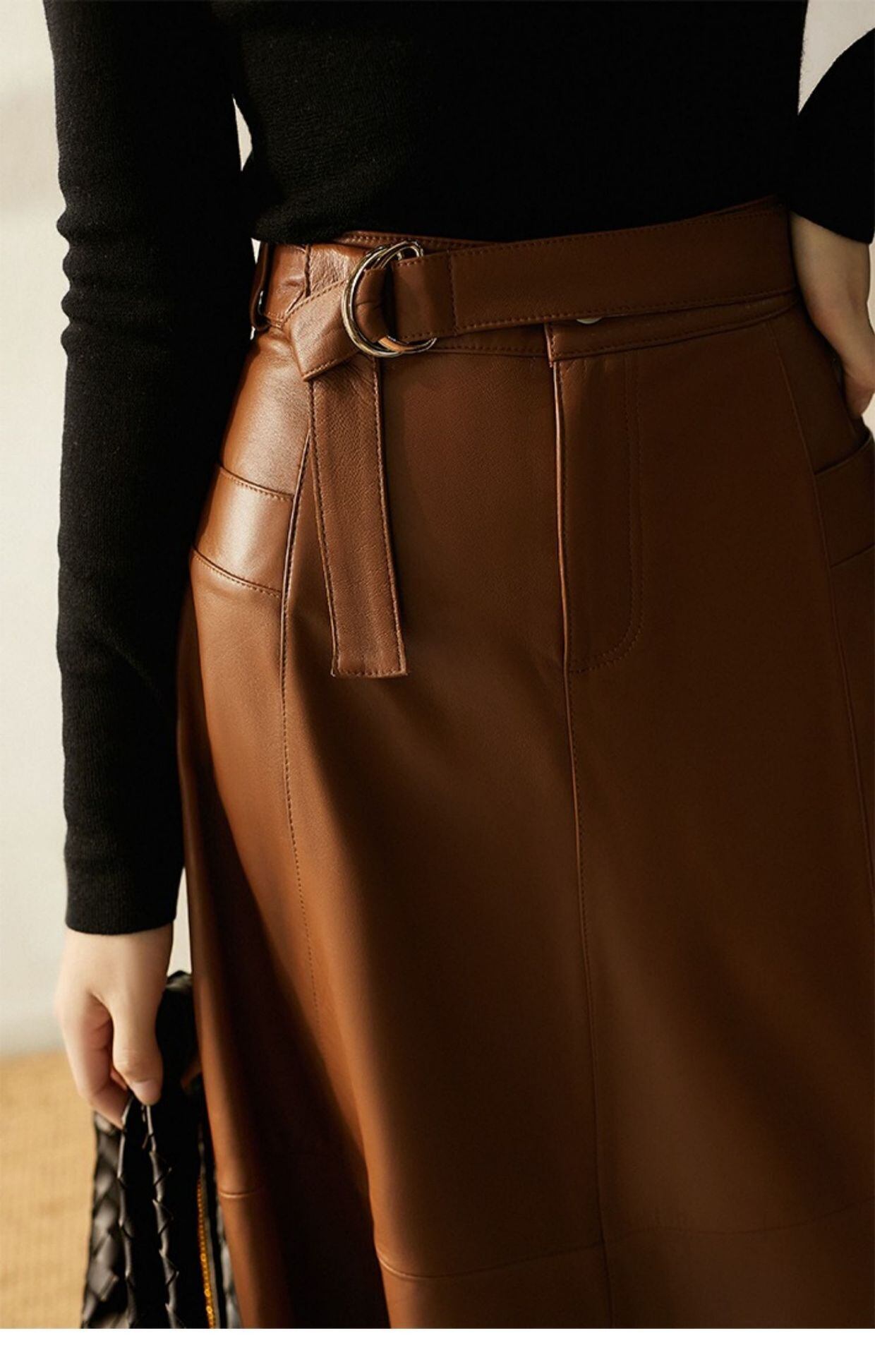 【送料無料】 レザースカート ハイウエスト ボトムス Aライン オルチャン レトロ きれいめ 韓国 レディース デート ブラウン 膝下 ロング丈 フレア スリム 細身 スマート ベルト ファスナー ポケット かわいい 大人可愛い シンプル 大人 上品 おしゃれ かっこいい レトロ 大人女子 こなれ感 キュート 個性的 クール モード系 エレガント モダン 主役級 存在感 抜け感 女性用 ママ 女の子 デート 女子会 お泊まり 休日 旅行 ガーデン レストラン ショッピング 普段使い