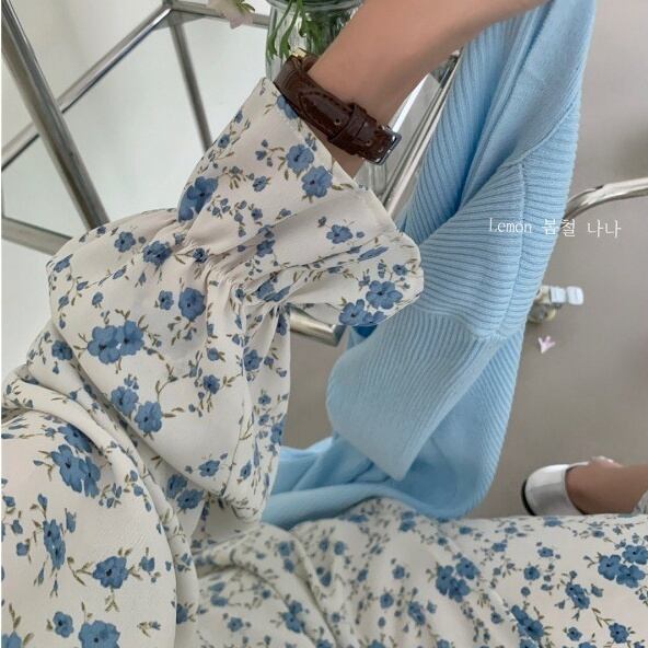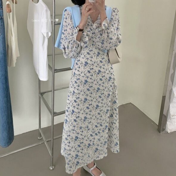 【送料無料】 ワンピース ロングワンピース シフォン 長袖 花柄 韓国 レディース オルチャン 小花柄 かわいい 可愛い キュート 大人可愛い 大人女子 シンプル きれいめ カジュアル 大人 気品 上品 おしゃれ お洒落 こなれ感 きちんと 着回し クール エレガント フェミニン S M L XL ブルー スリム 細身 青 白 ホワイト 10代 20代 30代 40代 OL 通勤 ママ 女子会 デート ショッピング コーデ トレンド インスタ映え スタイルアップ スタイル モテ