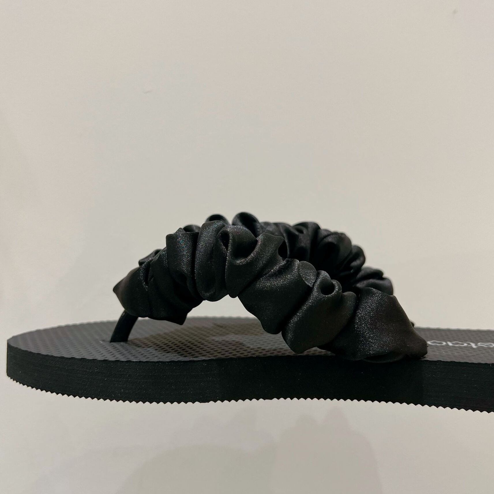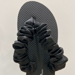 ビーチやプールサイドで活躍するブラックのビーチサンダルをご紹介します。ラウンドトゥが足元を可愛らしく演出し、フリルデザインが女性らしい雰囲気をプラスしてくれます。ぺたんこなデザインなので、歩きやすさも抜群です。