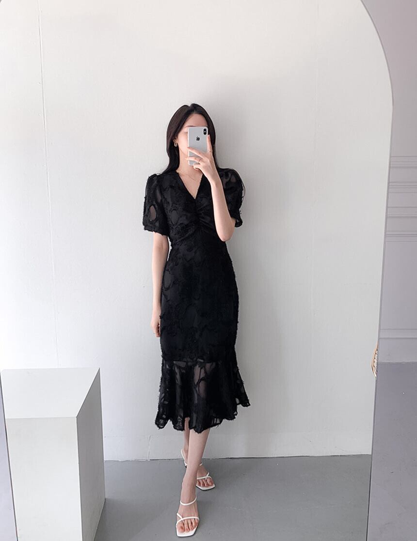 魅惑のVネックとエレガントなマーメイドシルエットが、女性らしい魅力を引き立てます。