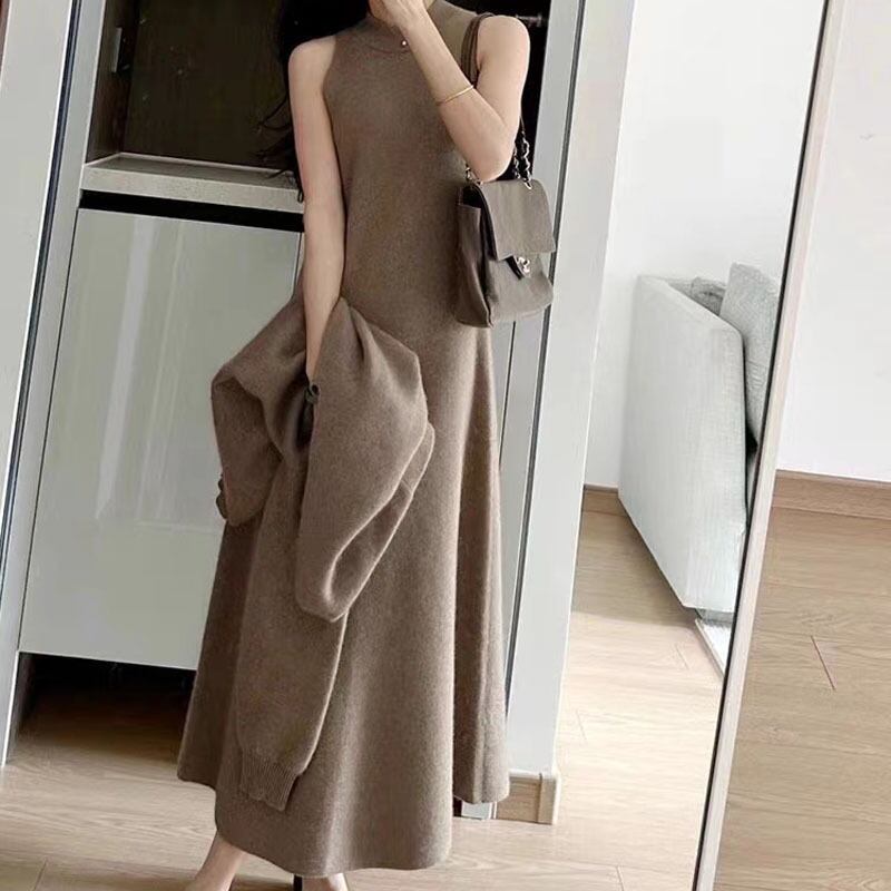 ノースリーブロングワンピースとリブニットの2点セットです。