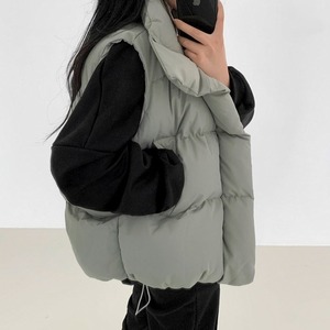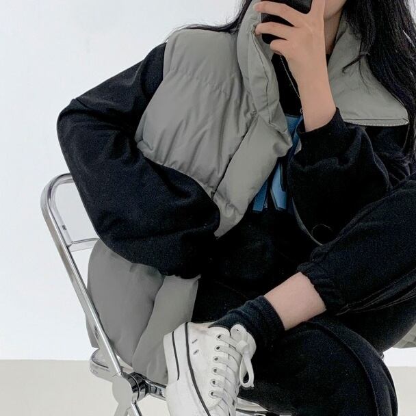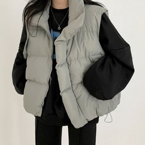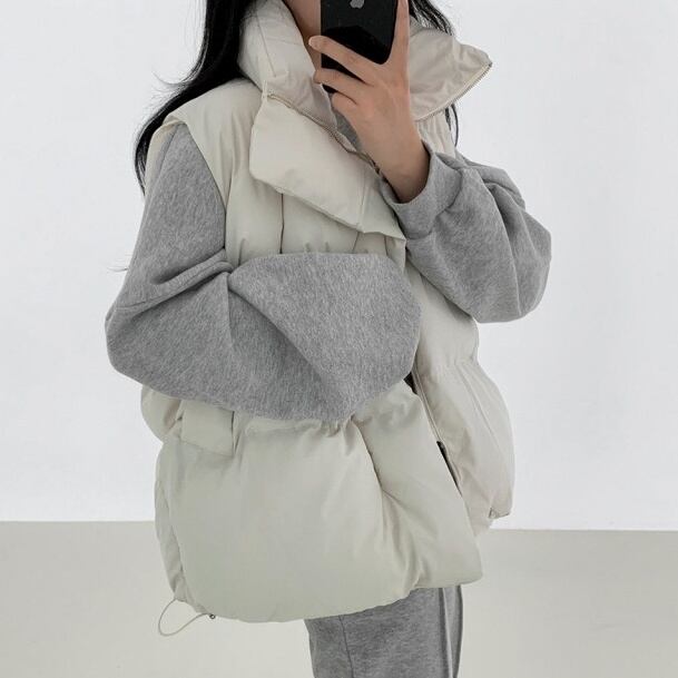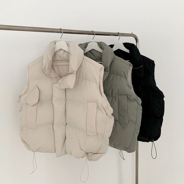 暖かさとおしゃれさを兼ね備えたノースリーブの中綿ジャケット。襟付きのデザインが大人っぽさを演出し、ポケット付きで実用性もバッチリ。かわいいオルチャンスタイルから、シックな大人コーデまで、幅広いスタイリングに対応します。