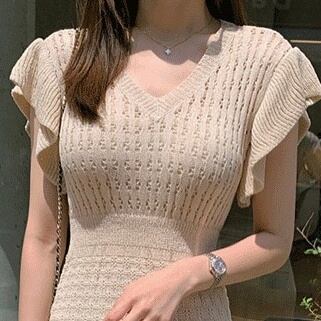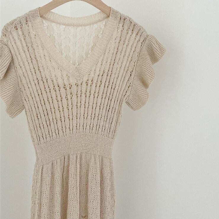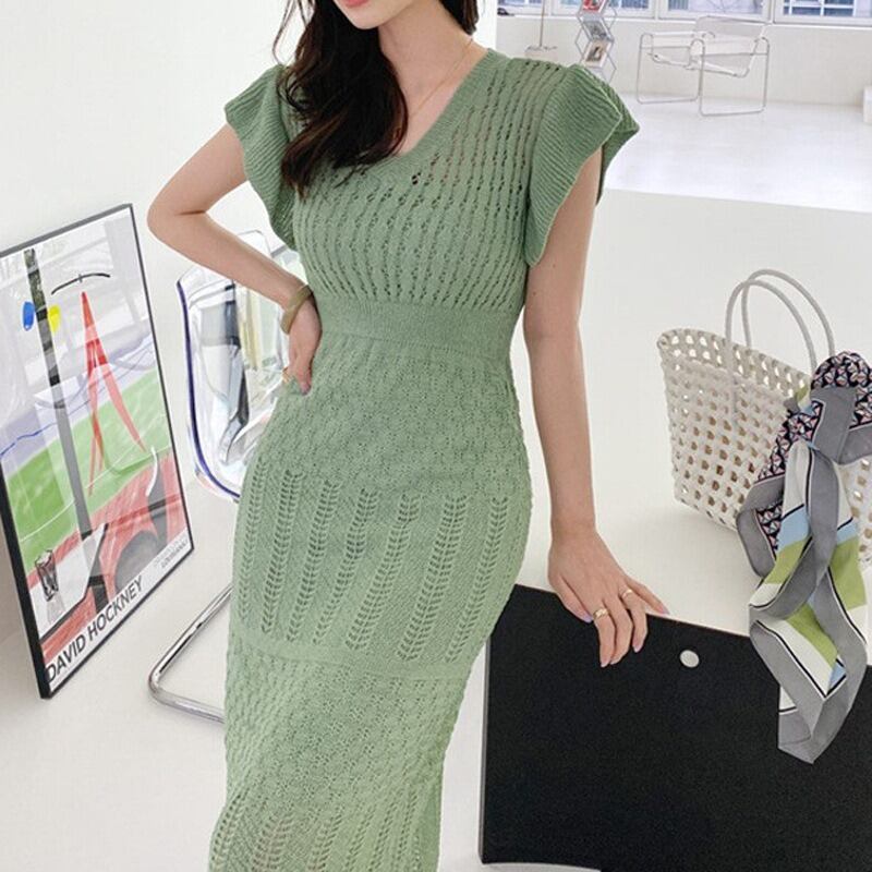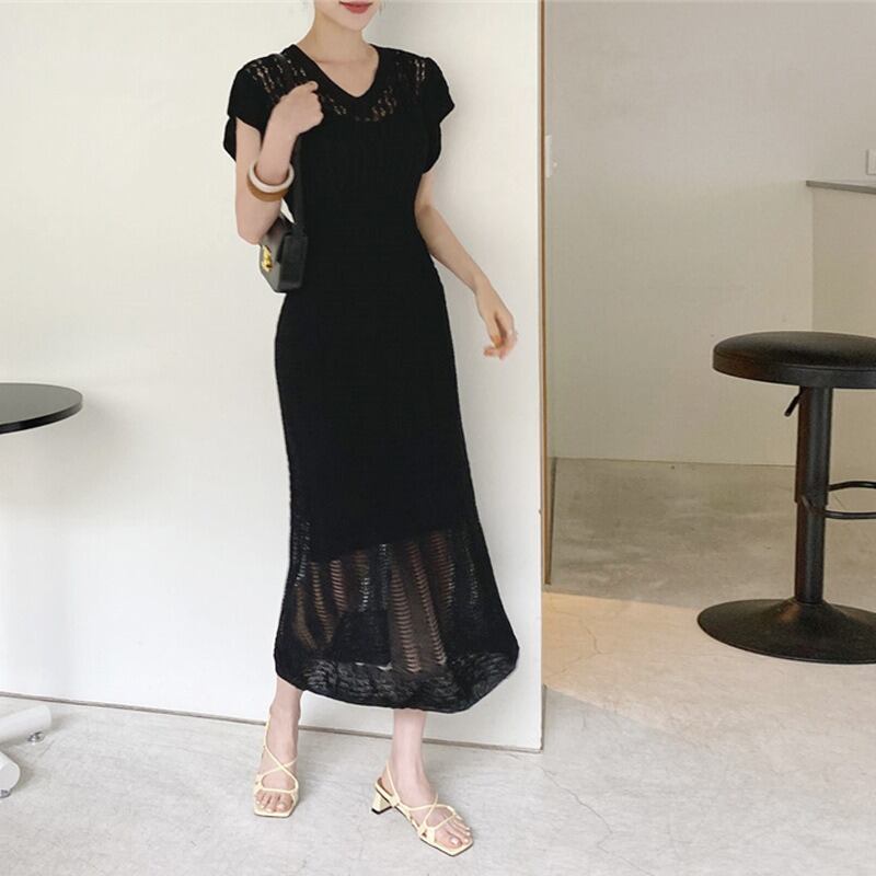 【送料無料】 サマーニットワンピース フレンチスリーブ ロングワンピース 夏 サマーニット 韓国 レディース オルチャン かわいい キュート ベージュ 黒 ブラック 緑 グリーン 伸縮性 大人可愛い 大人女子 シンプル きれいめ カジュアル 透かし編み 透け感 大人 気品 上品 お洒落 涼しい こなれ感 きちんと セクシー クール エレガント フェミニン 10代 20代 30代 女子会 デート 普段使い デイリー トレンド スタイル 細見え インスタ映え 個性的 モテ
