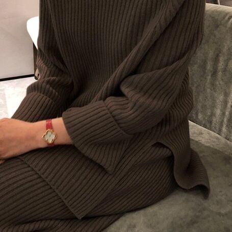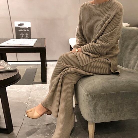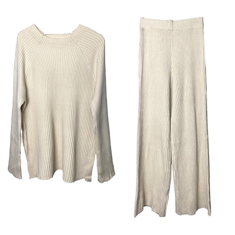長袖ニットのトップスとウエストゴムのワイドパンツがセットになっており、コーディネートの手間を省くことができます。リブ素材が体のラインを美しく引き立て、女性らしいシルエットを演出します。