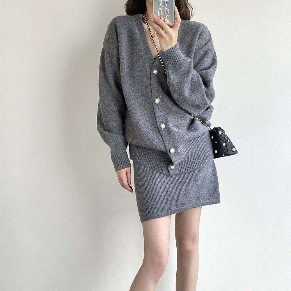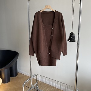 【送料無料】 カーディガン キャミソールワンピース セットアップ 2点セット 黒 韓国 レディース オルチャン ニットセットアップ パールボタン ニット ブラック 茶色 グレー ブラウン 白 オフホワイト ミニワンピース ニット2点セット 細身 スクエアネック 谷間が見える 女子会 可愛い 大人可愛い きれいめ オトナ女子 秋冬 秋 冬 春 暖かい フリーサイズ 大人カラー 食事会 10代 20代 30代 40代 デート 着回し 着痩せ モテ こなれ感 抜け感 ラフ 定番
