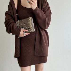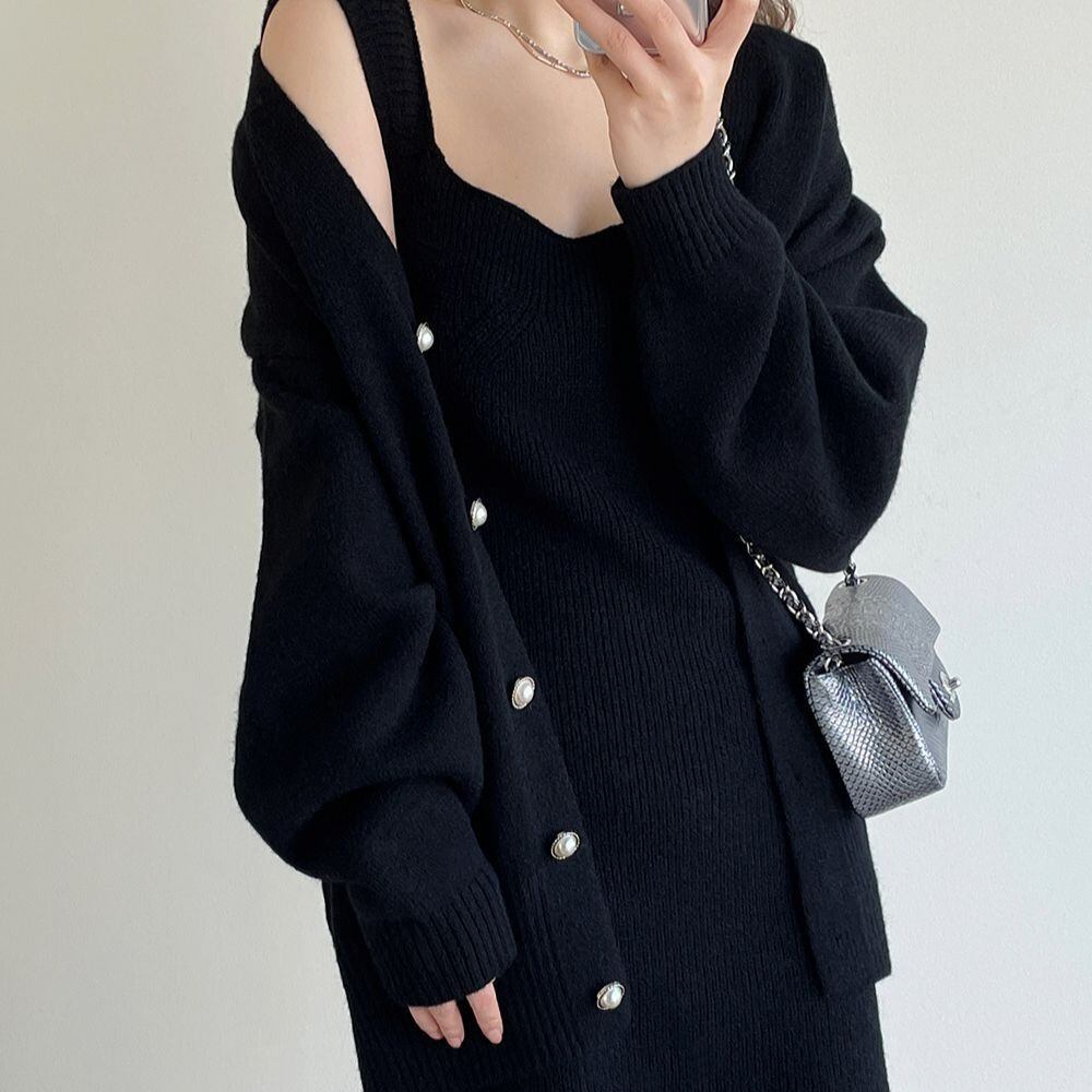 キャミソールワンピースと暖かいリブニットカーディガンの究極の組み合わせ、2点セット。キャミソールワンピースはスクエアネックで胸元を美しく演出します。柔らかなリブニットのカーディガンは、パールボタンがアクセントでフェミニンな雰囲気を放ちます。
