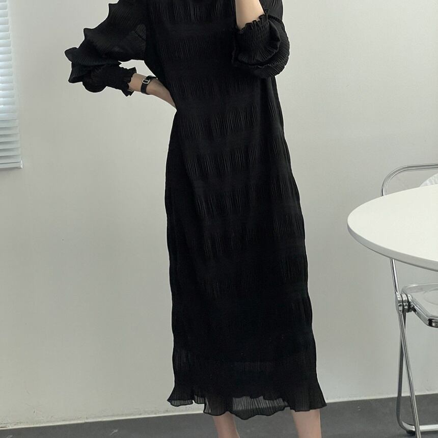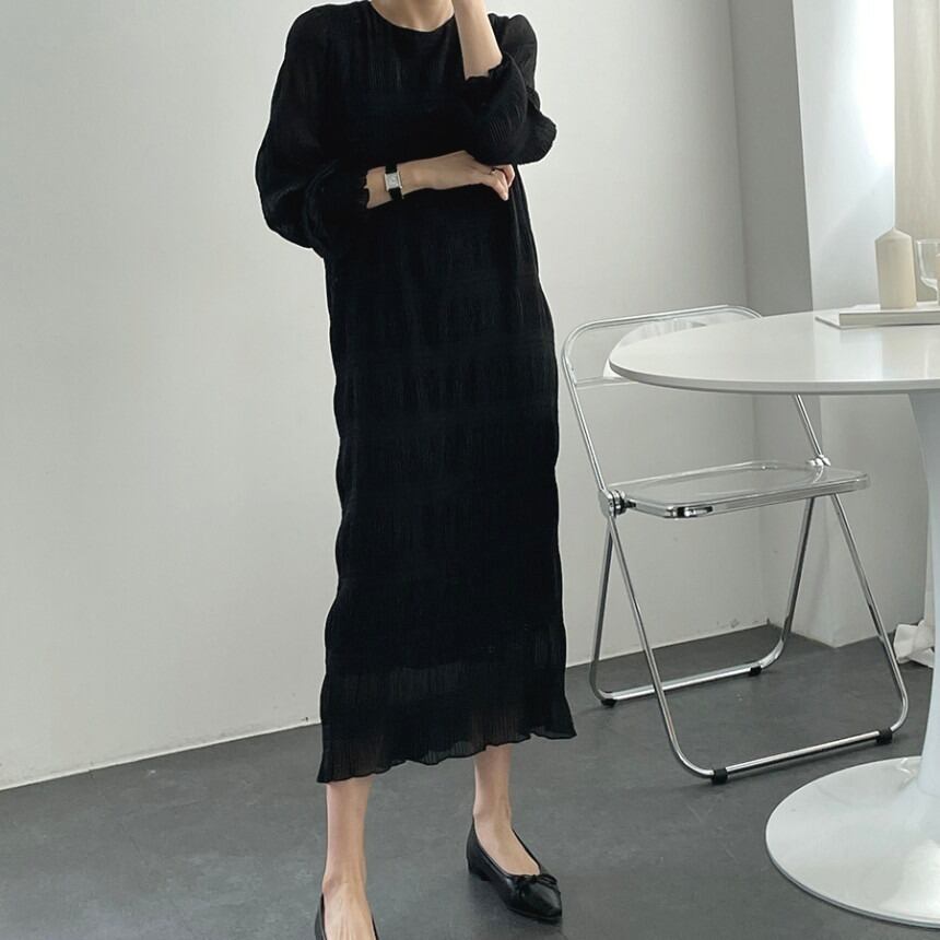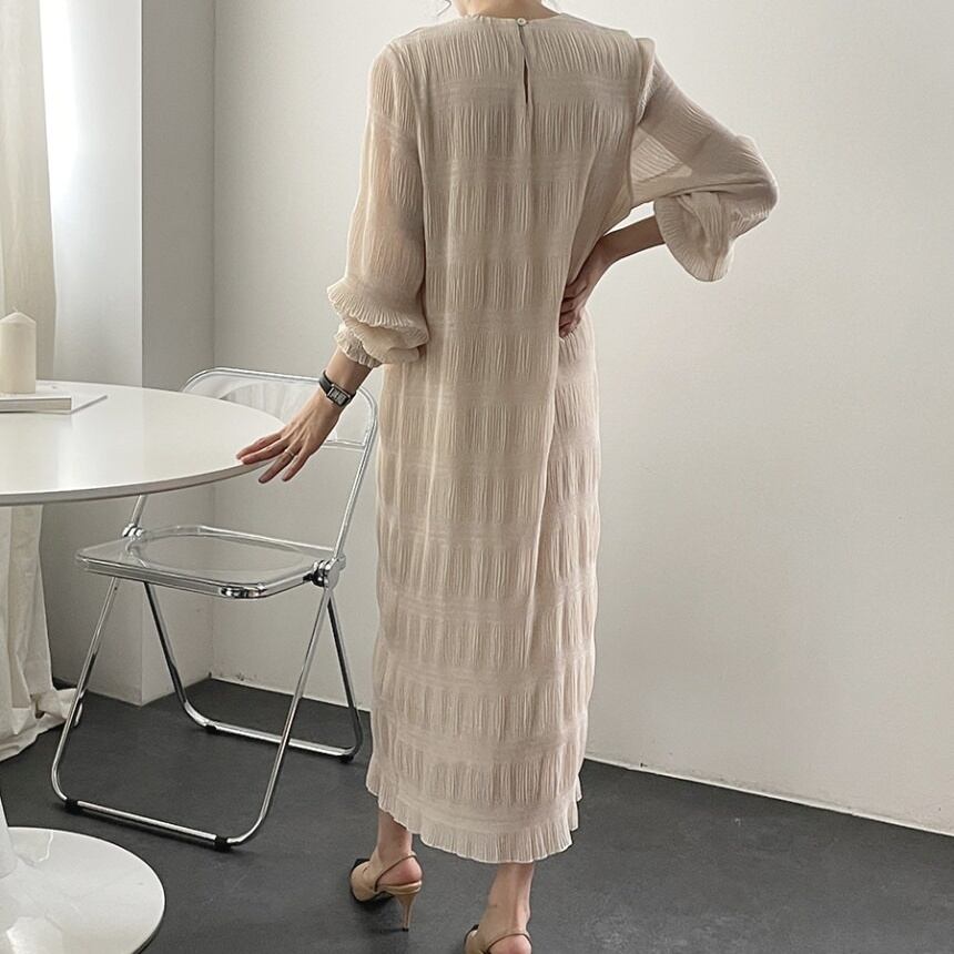 【送料無料】 シフォンワンピース ミモレ丈ワンピース ラウンドネック 長袖 Iライン 韓国 レディース オルチャン ロング丈 ルーズ 透け感 大人カジュアル 萌え袖 ぽわん袖 パフスリーブ リゾート ゆるサイズ 夏 海 プール 春 重ね着 シンプル ナチュラル 薄手 黒 オフィス ビジネス 通勤 OL オフホワイト 白 ブラック フリーサイズ 涼しい 楽ちん 上品 大人スタイル 体型カバー 大人可愛い 10代 20代 30代 40代 50代 ゆったり 女性用 デート 公園 ママ