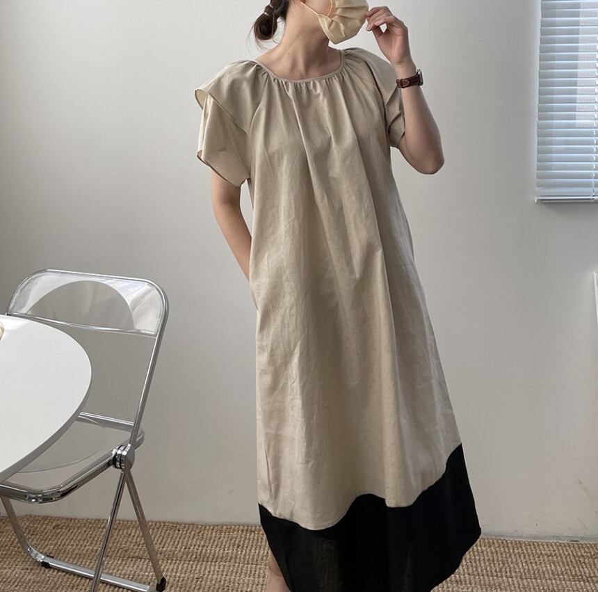 【送料無料】 配色ワンピース バイカラーワンピース ロング丈 バイカラー フリル袖 黒 Aライン 韓国 レディース オルチャンフリル ルーズ ブラック ベージュ 半袖ワンピ マキシ丈 大人カジュアル カジュアル リゾート ロングワンピース オーバーサイズ 夏 海 プール 春 フレンチスリーブ シンプル ナチュラル 薄手 フリーサイズ 涼しい 楽ちん 上品 大人スタイル 体型カバー 大人可愛い 10代 20代 30代 40代 ゆったり 女性用 デート 公園 ママ 袖あり