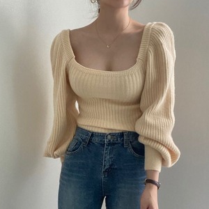 キュートでセクシーなスクエアネックのリブニットが登場しました!程よく谷間も見えるデザインで、女性らしさを引き立てる一着です。パフスリーブでふんわりとした袖も、可愛さを演出してくれます。ワイドなシルエットで二の腕もカバーしつつ、着やせ効果も◎です。