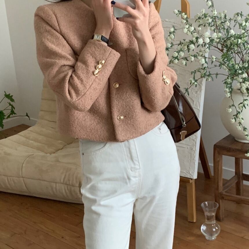 ラウンドネックのラフ感が可愛い、シンプルでコーディネートしやすいショート丈ジャケット。ノーカラーでシックな印象を与える一方、ポケットやボタンがアクセントとなり、オシャレ感も演出しています。