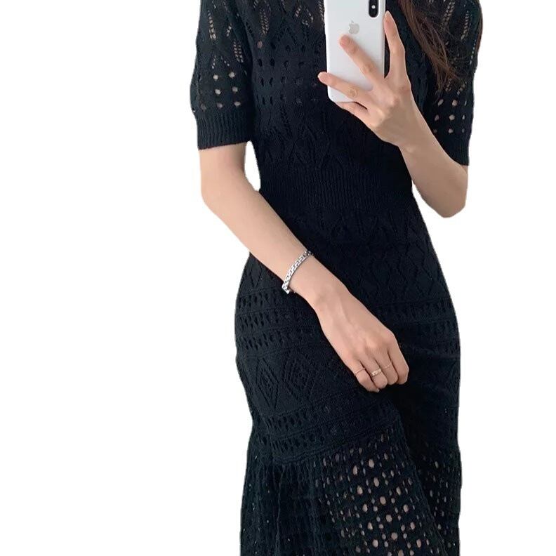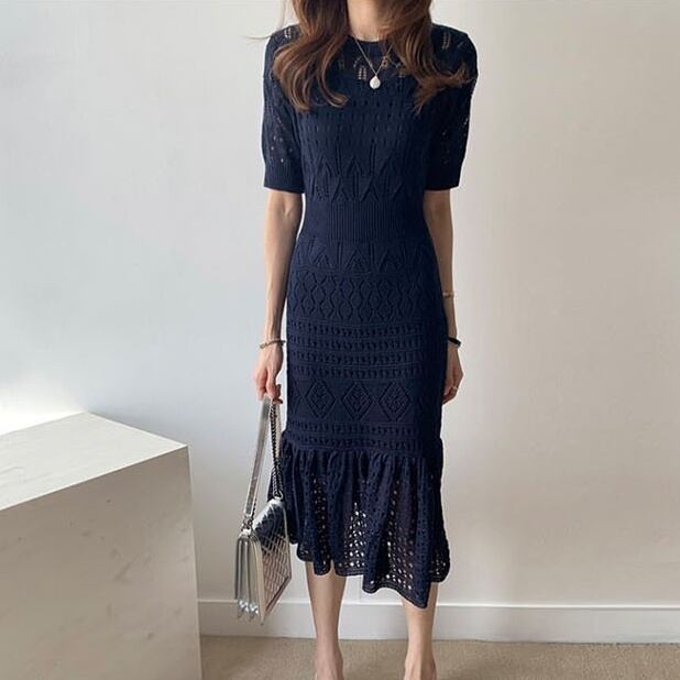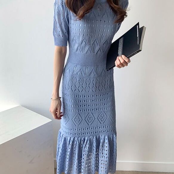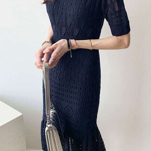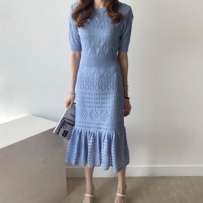 【送料無料】 サマーニットワンピース サマーワンピース 白 水色 夏 半袖 サマーニット 韓国 レディース オルチャン インナーキャミソール フィッシュテール キュート ホワイト ネイビー 黒 ブラック ミモレ丈 伸縮性 ロング丈 大人可愛い ミモレ丈ワンピ 大人女子 シンプル きれいめ カジュアル 透かし編み 透け感 大人 お洒落 涼しい こなれ感 きちんと エレガント フェミニン 10代 20代 30代 女子会 デート 普段使い デイリー トレンド スタイル 細見え インスタ映え 個性的
