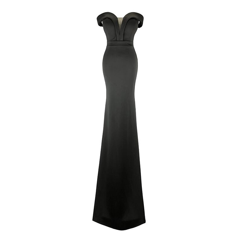 エレガントなフィッシュテールシルエットが魅力のロングドレス。オフショルダーで肌見せも程よく、華やかさを演出します。シンプルな無地デザインは、様々なパーティーシーンで活躍すること間違いなし。美しくスリムな細身シルエットで、セクシーで女性らしい装いに仕上げます。