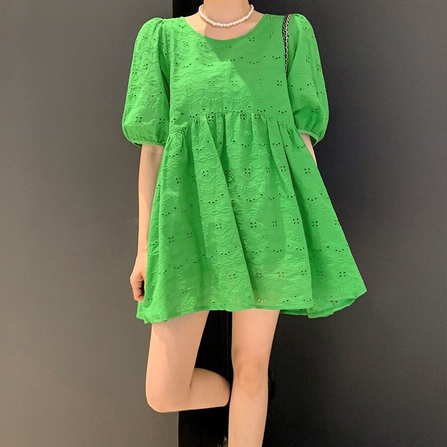 【送料無料】 ワンピース ミニ丈 ボリューム袖 ラウンドネック フリル レース チュニック 韓国 レディース オルチャン 可愛い 個性的 大人 ランタンスリーブ 緑 グリーン 黒 白 ホワイト かっこいい きれいめ おしゃれ 体型カバー お洒落 モテ オトナ女子 大人女子 インスタ映え 存在感 クール スタイルアップ デート シンプル 大人可愛い お出掛け こなれ感 夏 リゾート 海 イベント カジュアル セクシー フェミニン 10代 20代 30代 40代 女子会 トレンド 細見え