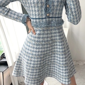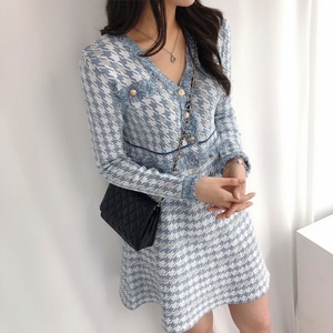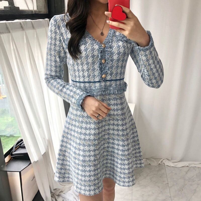【送料無料】 ワンピース ミニスカート 千鳥格子 長袖 Vネック ウエストマーク 韓国 レディース オルチャン スリム 膝上丈 細身 可愛い 白 水色 大人可愛い 千鳥柄 金ボタン 上品 カジュアルスーツ おしゃれ Aライン オトナ女子 個性的 ミニ丈ワンピース フェミニン フリーサイズ 食事会 忘年会 同窓会 保護者会 謝恩会 クリスマス 誕生日 春 秋 冬 10代 20代 30代 40代 女性用 デート 女子会 休日 パーティー イベント 高級感 スタイルアップ 脚長 モテ 二次会