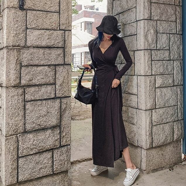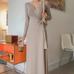 Vネックデザインでセクシーな雰囲気漂う長袖マキシワンピースが登場しました。流行のウエストリボンデザインがポイントで、ウエストを細く見せてくれます。洗練された大人の魅力を引き立てつつ、女性らしさもしっかりと演出してくれるアイテムです。