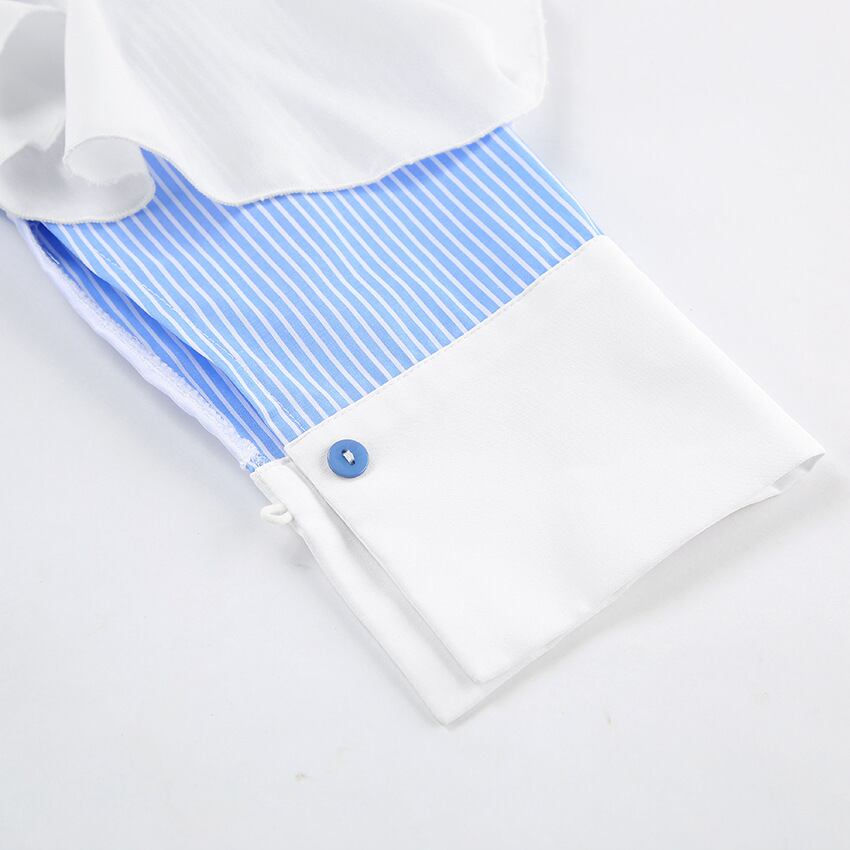 【送料無料】 フリルシャツ フリルブラウス ストライプ 個性的 ボリューム袖 韓国 レディース オルチャン トップス パーティー スタンドカラー 長袖 可愛い 大人 かっこいい きれいめ 高級感 高見え おしゃれ 体型カバー お洒落 モテ 女っぽい 大人っぽい 上品 美人 エレガント ゴージャス オトナ女子 大人女子 インスタ映え 主役級 存在感 クール スタイルアップ デート 大人可愛い お出掛け こなれ感 カジュアル きちんと 20代 30代 40代 女子会 トレンド 普段使い イベント