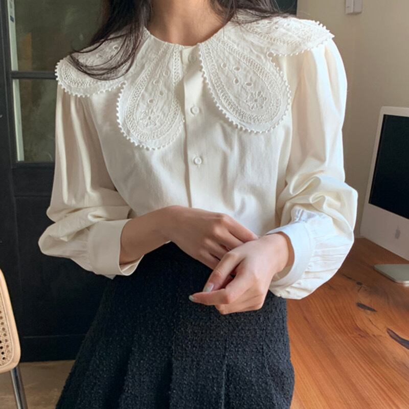 【送料無料】 レースビッグカラー ブラウス 長袖 花柄ブラウス 刺繍ブラウス 韓国 レディース オルチャン トップス 可愛い 個性的 大人 かっこいい きれいめ 高級感 高見え おしゃれ 体型カバー お洒落 モテ 女っぽい 大人っぽい 上品 美人 エレガント ゴージャス オトナ女子 大人女子 インスタ映え 主役級 存在感 クール スタイルアップ デート シンプル 大人可愛い お出掛け こなれ感 カジュアル きちんと 20代 30代 女子会 トレンド 普段使い イベント パーティー 着回し