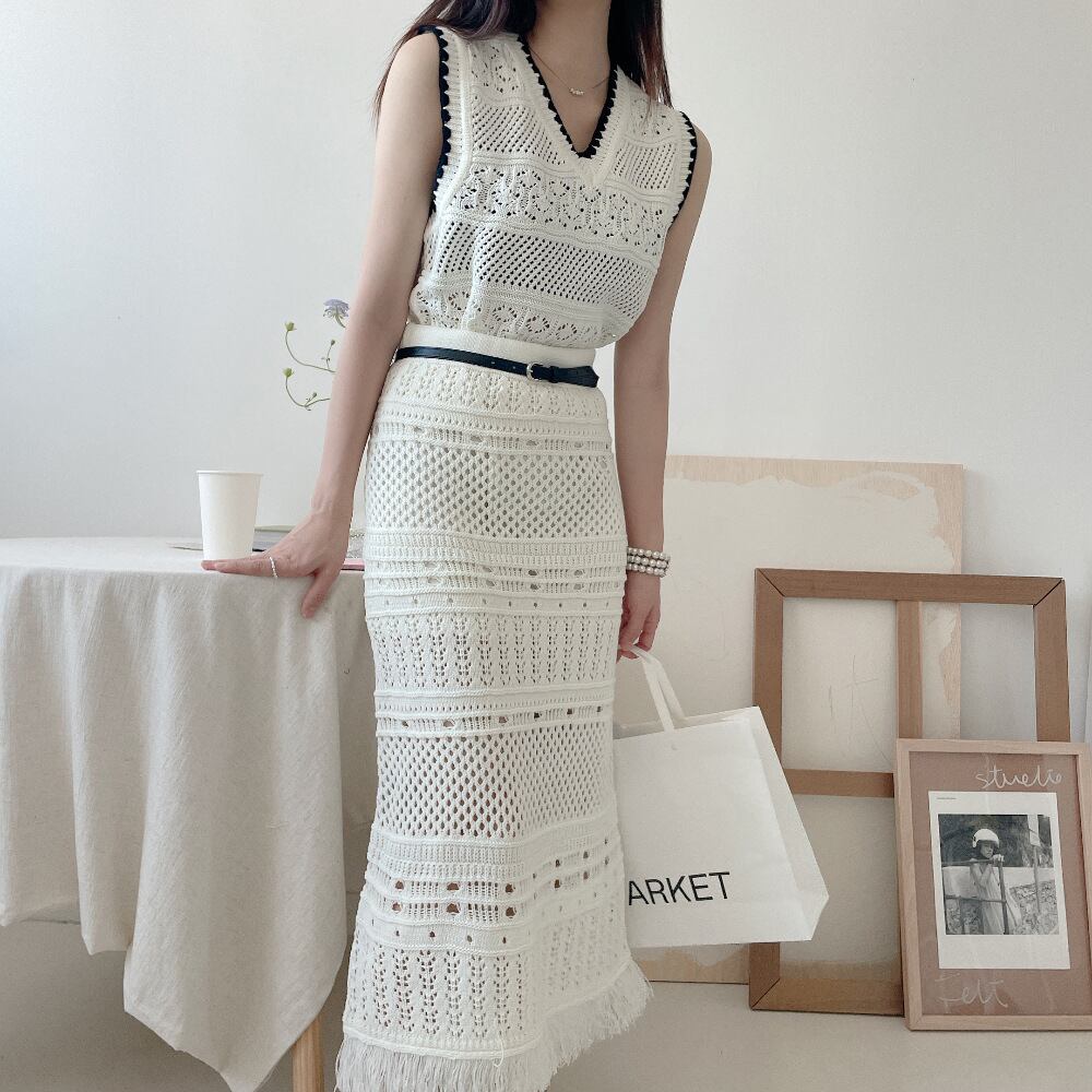 トレンド感満載のニットベストとタッセルスカートのセットアップです。シックで上品な印象を演出するロング丈スカートは、ハイウエストでスリムなシルエットを作り出します。また、タッセルのディテールがアクセントになっており、一体感のあるコーディネートを楽しめます。