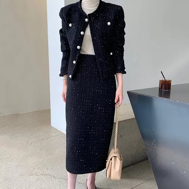 【送料無料】 ツイードスーツ レディース 黒 2点セット ジャケットスカート ミディ丈 セットアップ 韓国 レディース 上下セット ジャケット ツイード スカート ハイウエスト スリム 可愛い 大人可愛い 大人女子 きれいめ シンプル カジュアル 大人 お洒落 こなれ感 きちんと 大人女子 クール エレガント フェミニン レトロ S M L XL ブラック 秋 冬 20代 30代 40代 お呼ばれ OL 通勤 お呼ばれ 女子会 デート コーデ スタイル 脚長 インスタ映え