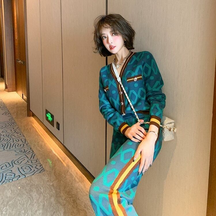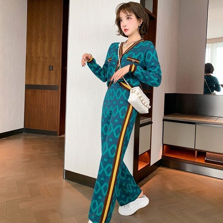【送料無料】 カーディガン ニット ワイドパンツ ニットセットアップ 緑 韓国 レディース オルチャン ロングパンツ ニットパンツセットアップ ツーピース グリーン 黄色 サイドライン Vネック 幾何学模様 ウエストゴム ニットパンツ ニット2点セット 女子会 大人可愛い きれいめ オトナ女子 金ボタン 秋冬 秋 冬 春 暖かい L XL 2XL 大人カラー 個性的 10代 20代 30代 40代 50代 デート 旅行 着回し 着痩せ モテ こなれ感 抜け感 ラフ 定番