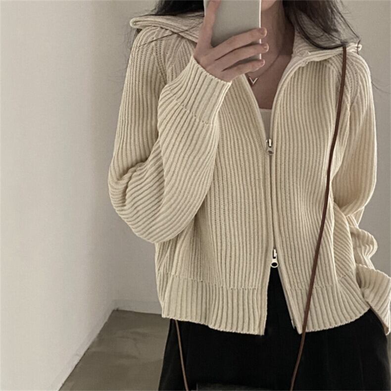 【送料無料】 ニット ジップアップセーター カーディガン Vネック 韓国 レディース オルチャン ポケット 大人可愛い 黒 白 ホワイト ブラック グレー ダークグレー シンプル カジュアル 袖リブ ウエストリブ ジッパー アクティブ ベーシック ナチュラル モノトーン かっこいい オトナ女子 大人女子 無地 秋 冬 休日 アウトドア 旅行 着回し 普段使い 重ね着 暖かい 防寒 体型カバー トレンド 流行 インスタ映え フリーサイズ ワンサイズ ゆったり 着回し 着やせ