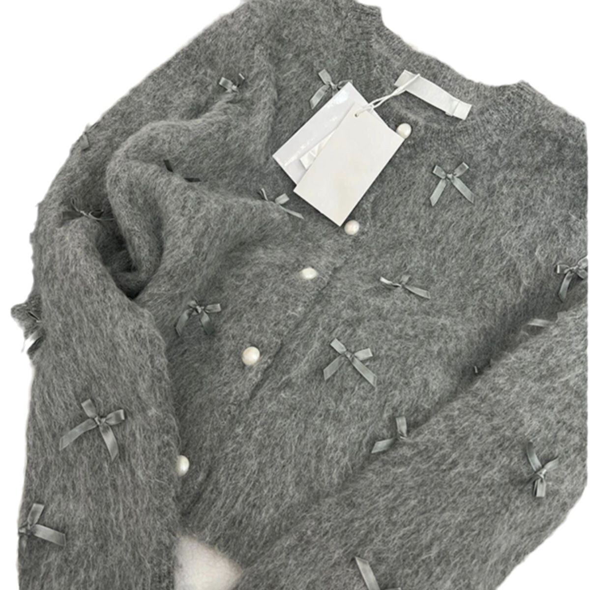 【送料無料】 リボントップス リボンニット リボンカーディガン リボン ニット カーディガン モヘア パール 韓国 レディース オルチャン あったか パールボタン 襟なし 女子会 可愛い 大人可愛い きれいめ 暖かい グレー 秋 冬 ミニリボン 秋冬 フリーサイズ 二次会 同窓会 食事会 10代 20代 30代 オフィス OL デート 着回し セーター モテ ラブリー かわいい 女子会 休日 コーデ フェミニン