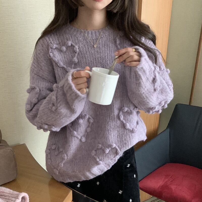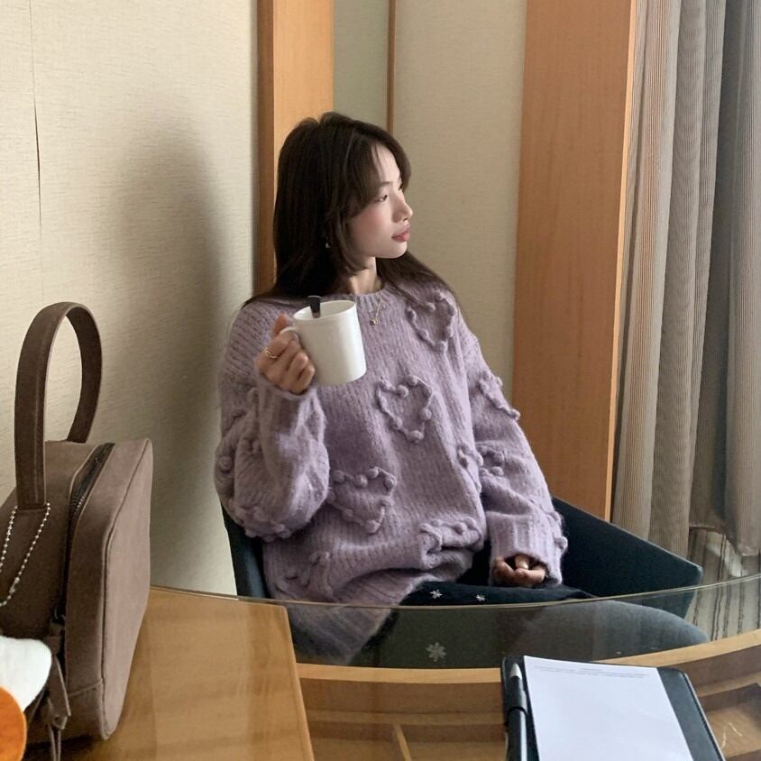 ふんわりとしたモヘア素材が心地よい肌触りの、魅力的なニットセーター。トレンドのハートマークが立体的にデザインされた、キュートなアイテムです。ラウンドネックなので、シンプルながらも女性らしい印象を与えます。