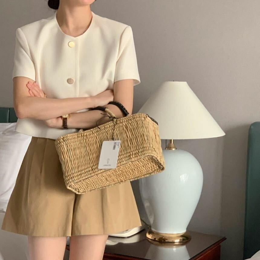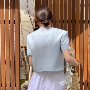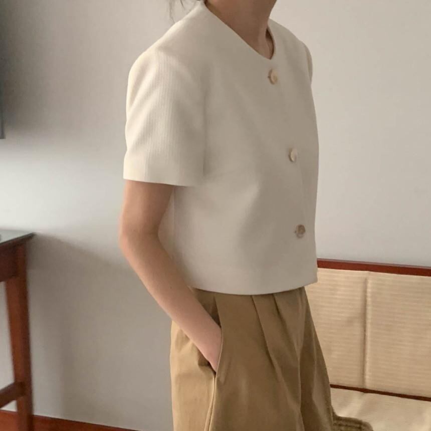 【送料無料】 ノーカラージャケット ジャケット 半袖 ハーフスリーブ ショート丈 ボタン 韓国 レディース オルチャン きれいめカジュアル 無地 オフィス オフホワイト 水色 黒 ブラック 細身 かわいい 可愛い オフィス 大人可愛い 大人女子 シンプル フォーマル 大人 上品 おしゃれ サマー お洒落 こなれ感 抜け感 きちんと クール 入学式 入園式 フェミニン ワンサイズ 夏 10代 20代 30代 40代 50代 OL 通勤 女子会 デート コーデ トレンド