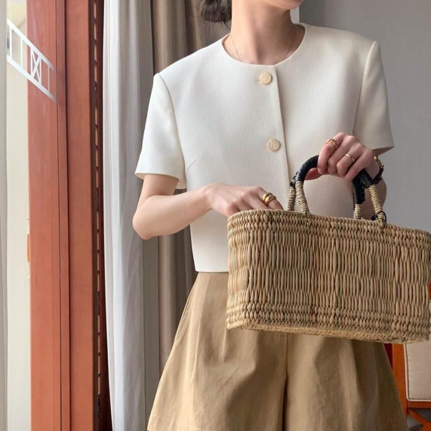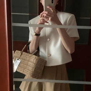 清涼感漂う夏にぴったりのハーフスリーブジャケットが登場しました。シンプルで洗練されたデザインは、オフィスはもちろんカジュアルなシーンでも活躍します。女性らしいウエストラインを引き立てるショート丈とノーカラーデザインが、あなたのスタイルをより一層引き立てます。