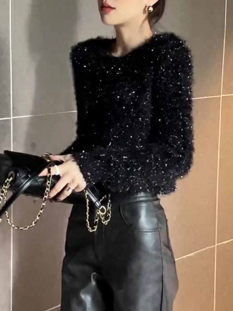 【送料無料】 ラメ シャギーニット 黒 キラキラ 韓国 レディース オルチャン トップス ミニ丈 ミニ ショート ショート丈 袖あり 長袖 ラウンドネック かわいい 大人可愛い きれいめ シンプル 大人 おしゃれ お洒落 大人可愛い 大人女子 こなれ感 キュート 存在感 抜け感 秋 冬 10代 20代 30代 通学 デート 女子会 お泊まり 休日 イベント 旅行 レストラン 着回し 普段使い 韓国系 コーデ スタイル 楽ちん 暖かい 防寒 モテ トレンド 流行