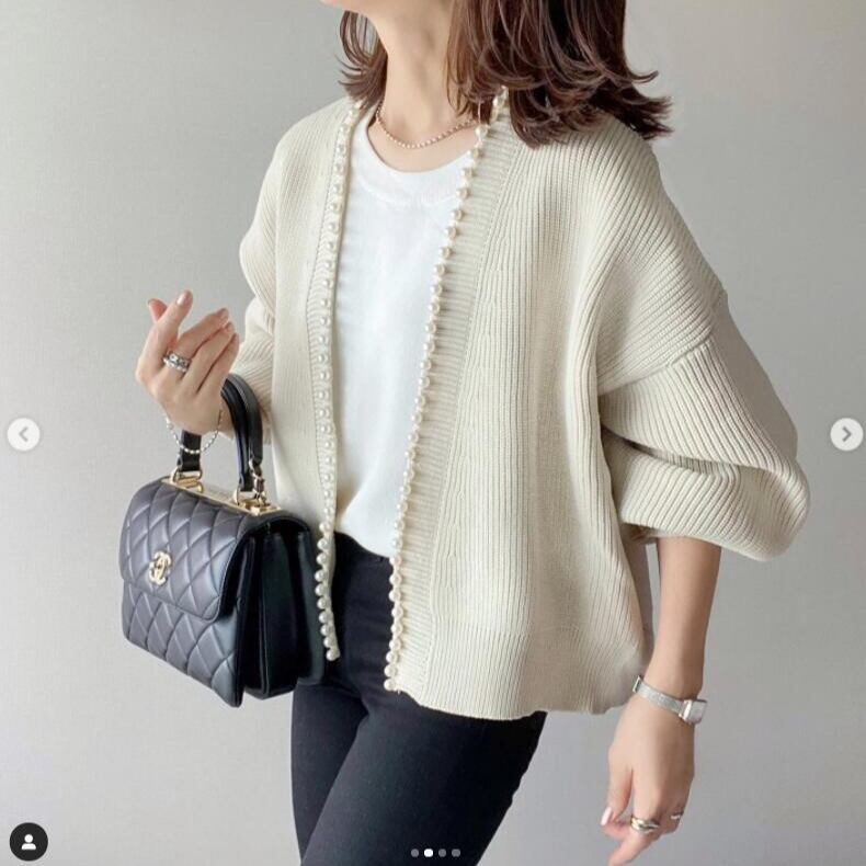 華やかなパールトリムが目を引くランタンスリーブのカーディガン。前開きで着脱も簡単で、ルーズなシルエットが大人可愛い雰囲気を演出します。カジュアルからきれいめまで、幅広いコーディネイトに活躍する一枚です。
