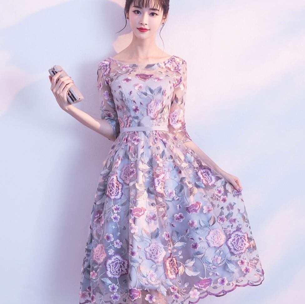 【送料無料】 イブニングドレス パーティードレス レースワンピース 七分袖 ノースリーブ 紫 パープル 韓国 レディース オルチャン ワンピースドレス カジュアルドレス 膝丈 ひざ丈 ラウンドネック Aライン レース 刺繍 ウエストマーク バックシャン バックコンシャス ハイウエスト 透け感 シースルー 大人可愛い ラブリー キュート エレガント フォーマル 華やか クラシック 王道 花柄 フラワー 休日 イベント 高見え 格上げ インスタ映え 夏 ステージ 撮影 S M L XL 2XL