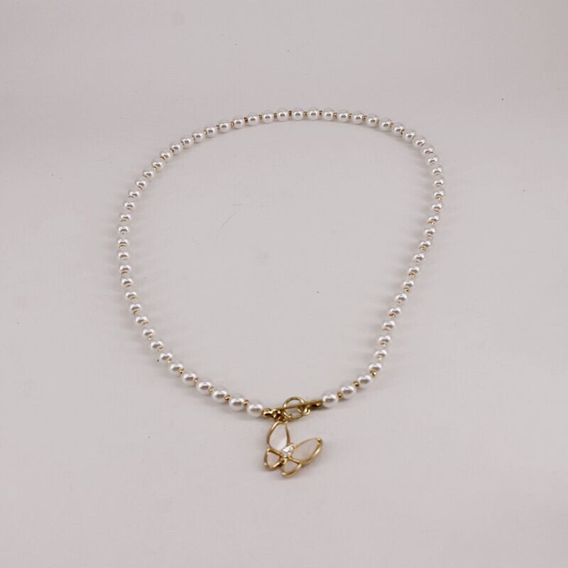 パールチョーカーに蝶々のチャームがエレガントな魅力を添えます。オールシーズン対応で、パーティーやデート、普段使いまで幅広く活躍。