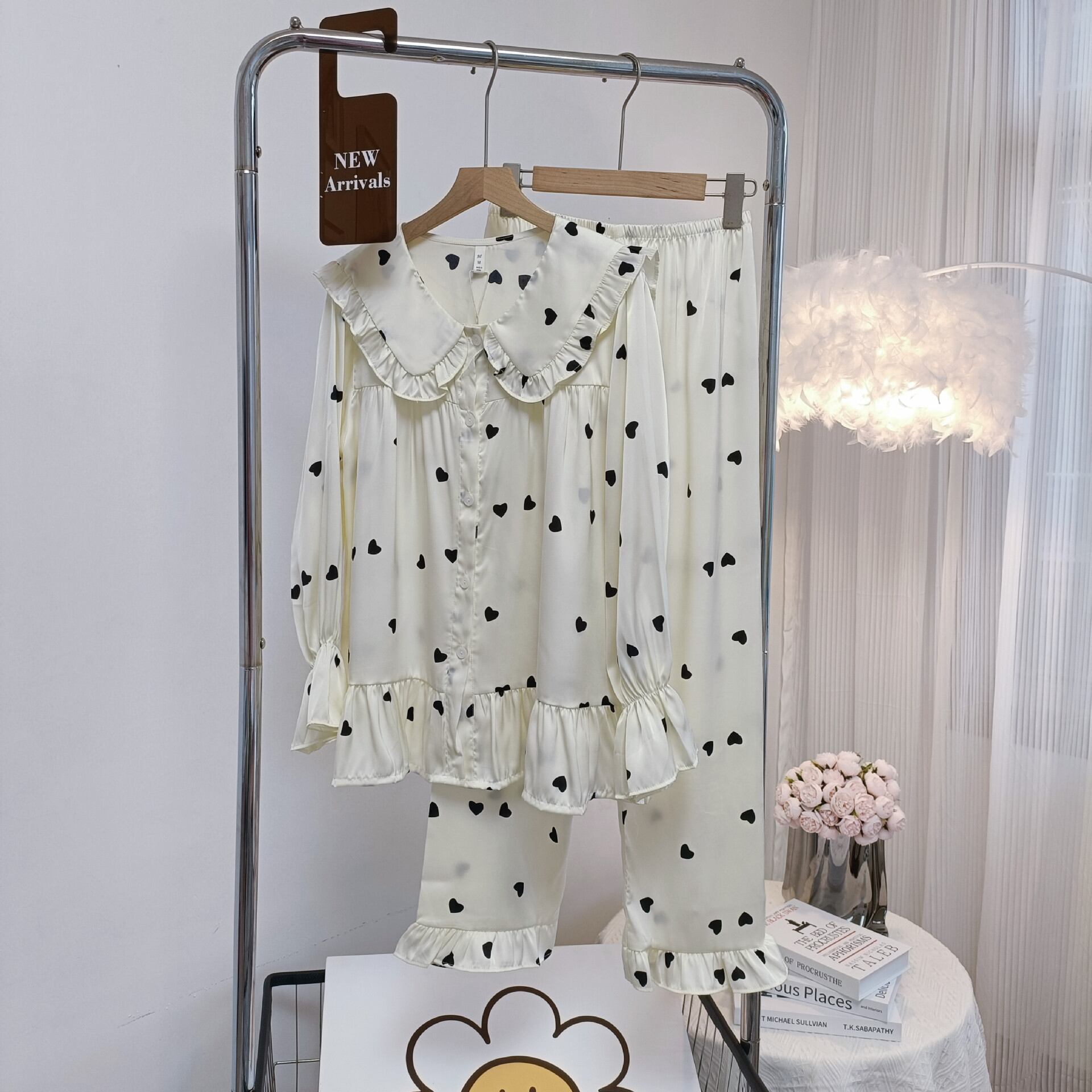 可愛らしいハート柄が印象的なルームウェアパジャマセット。長袖の襟付きトップスにはフリルや前開きボタンがアクセントとして施され、フェミニンな雰囲気を漂わせます。ルーズな着心地でリラックスできるだけでなく、着心地の良さも抜群です。