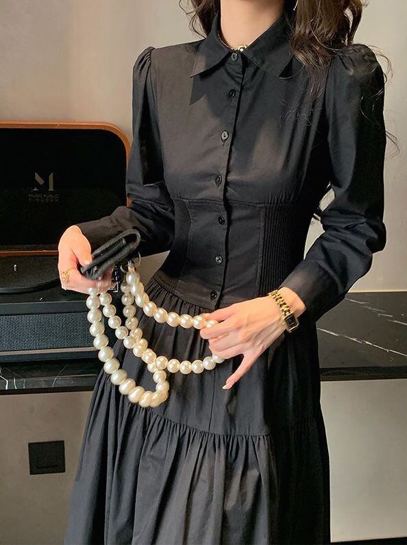 【送料無料】 フレンチレトロシャツワンピース ワンピース 長袖 ロング丈 襟付き Aライン ボタン 無地 ハイウエスト スリム 細身 韓国 レディース かわいい 可愛い 大人可愛い 大人女子 シンプル きれいめ フォーマル 大人 気品 上品 おしゃれ お洒落 こなれ感 抜け感 かっこいい きちんと 大人女子 クール エレガント モダン シック フェミニン S M L XL 2XL 3XL ブラック 秋 オルチャン 20代 30代 40代 お呼ばれ パーティー トレンド 脚長