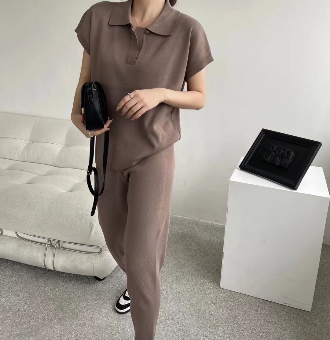 【送料無料】 カジュアルニットセットアップ ニットソー 半袖 襟付き ポロカラー パンツ ストレートパンツ ハイウエスト 無地 2点セット 上下セット ルーズ 韓国 レディース 大人可愛い 大人女子 シンプル きれいめ カジュアル 大人 気品 上品 おしゃれ お洒落 こなれ感 抜け感 かっこいい きちんと 大人女子 クール モダン フェミニン S M L ブラウン キャメル オフホワイト ブラック 秋 冬 オルチャン 20代 30代 40代 デート 女子会 普段使い トレンド 楽チン