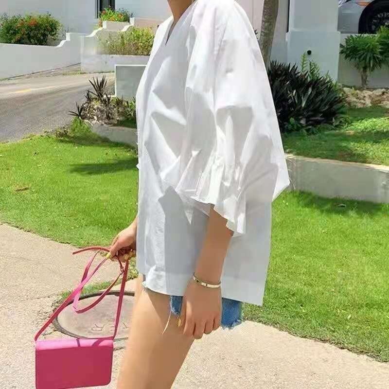 【送料無料】 シャツ カットソー 黒 7分袖 Vネック 白シャツ オルチャン レディース 韓国 トップス ホワイト ブラック 白 黒 七分袖 袖あり ゆったり フリーサイズ スマート 夏 ボリューム袖 フリル かわいい 大人可愛い きれいめ シンプル カジュアル 大人 おしゃれ かっこいい 大人女子 こなれ感 ラフ キュート 個性的 クール 抜け感 女性用 ママ 女の子 デート 女子会 お泊まり 休日 イベント リゾート 旅行 海 プール レストラン ショッピング 普段使い