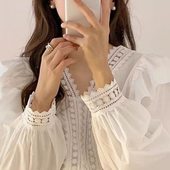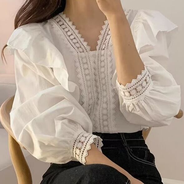 【送料無料】 シャツ カットソー 長袖シャツ プルオーバー Vネック 白シャツ オルチャン レディース 韓国 黒 ブラック トップス ホワイト 白 長袖 透け感 ゆったり レース フリーサイズ フレンチスリーブ 10代 20代 30代 40代 50代 春 夏 S M L XL ボリューム袖 ぽわん袖 かわいい 春夏 大人可愛い シンプル カジュアル 大人 おしゃれ 大人女子 こなれ感 ラフ 個性的 抜け感 デート 女子会 休日 イベント リゾート 旅行 ショッピング 普段使い