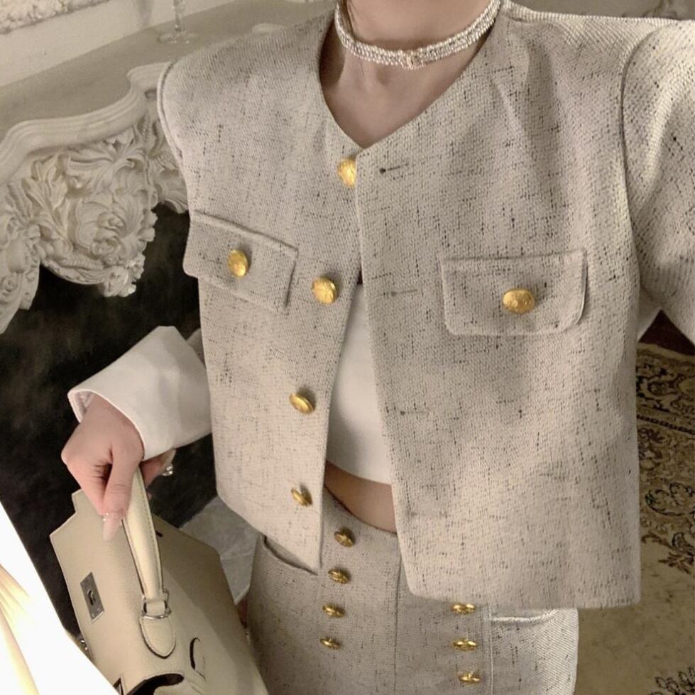 【送料無料】 パンツスーツ セットアップ クロップジャケット ワイドパンツ 金ボタン 韓国 レディース オルチャン 上下セット 2点セット ツーピース ストレートパンツ ゴールドボタン ベージュ ノーカラー ラウンドネック ポケット 上着 スーツ 長袖 スリム 細身 大人可愛い きれいめ シンプル 大人 上品 おしゃれ お洒落 かっこいい 大人女子 こなれ感 クール モード系 エレガント モダン 主役級 存在感 オールシーズン ビジネス OL 通勤 デート 女子会 休日 入学式